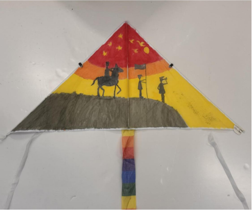 另一幅以爱国为主题的风筝也备受瞩目,它以红色和黄色为主色调,以一面鲜艳的五星红旗为背景,绘制了革命先辈们驰骋战场的场景,表达了对红色基因的传承和对祖国的热爱。