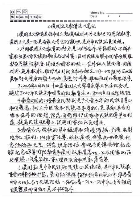 活动中,同学们认真学习贯彻《中华人民共和国爱国主义教育法》,并将所学重点内容以笔记的形式进行总结和分享,展现了积极的学习态度,用实际行动践行爱国主义精神。本次活动共收到笔记50件,经过活动组委会公开评选,最终推选出10篇优秀作品。