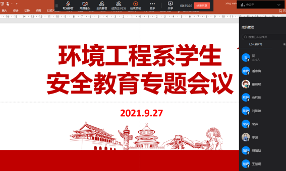9月27日下午,环境工程系通过钉钉平台召开秋季开学安全工作专题会议。会议由系党总支书记郭海山主持,系全体学管教师及辅导员参加。