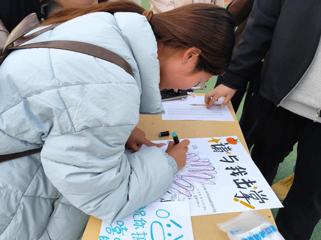 “请与我击掌!”—在鼓励中传递温暖:参与者在手印图纸上留下真诚的激励话语,以有形的方式凝聚情感支持,营造积极向上的心理氛围,强化“劳育”中所倡导的共享与协作精神。
