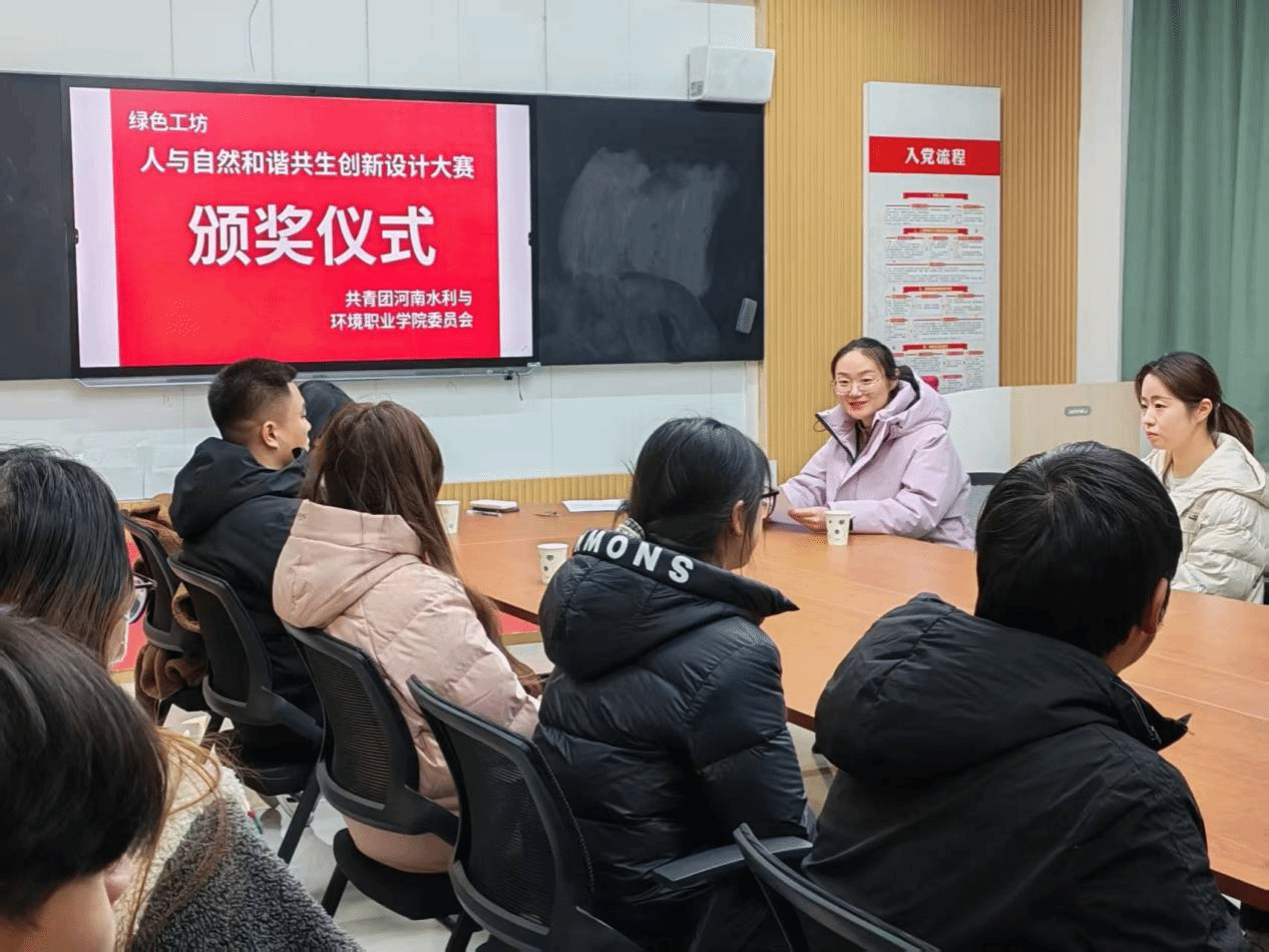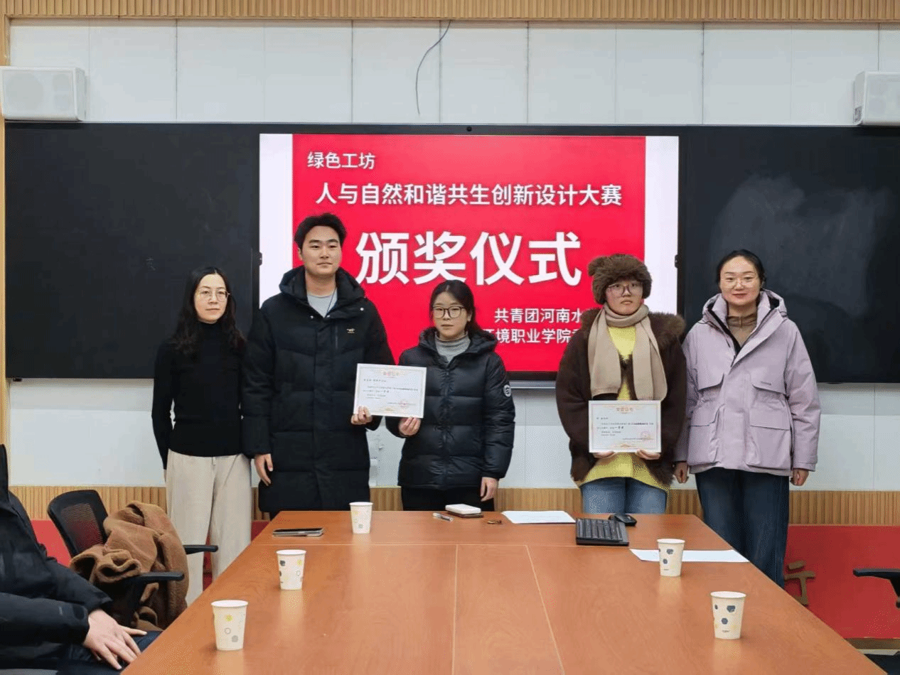 1月8日,河南水利与环境职业学院第一届人与自然和谐共生创意设计大赛颁奖仪式在笃行楼顺利举行。本次大赛由共青团河南水利与环境职业学院委员会、环境与生态学院绿色工坊社团与河南隽源环保科技有限公司联合主办。环境与生态学院党总支书记邢伟明、校团委副书记张宏宇、团委教师张少严、学院教师及企业代表出席活动,并为获奖学生颁奖。