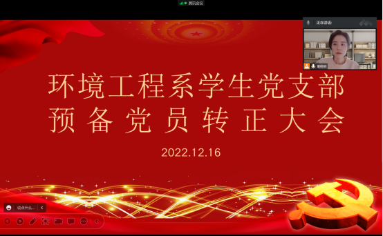 12月16日,环境工程系学生党支部通过线上形式举办了预备党员转正大会,讨论赵睿杰等15名预备党员的转正事宜。会议由系学生党支部书记董晓明主持,支部全体党员参加。