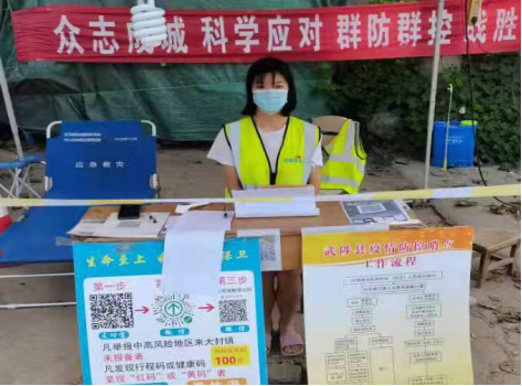 8月21日-8月23日,王宝睿在辉县市峪河镇毛庄村担任疫情防控志愿者,在村庄疫情防控卡点值班,对外来人员进行信息登记、扫码测温,并负责村庄的日常消毒工作。她说:“面对严峻的疫情形势,作为一名当代大学生,我有义务担当起疫情防控的责任,与家乡人民联合以来,勠力同心,抵御病魔。”
