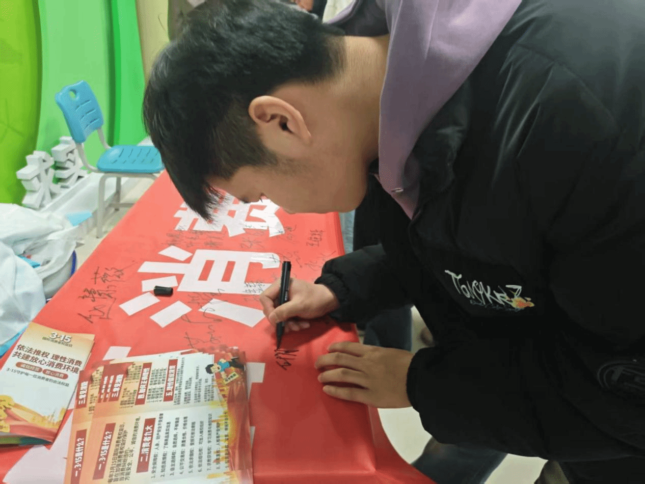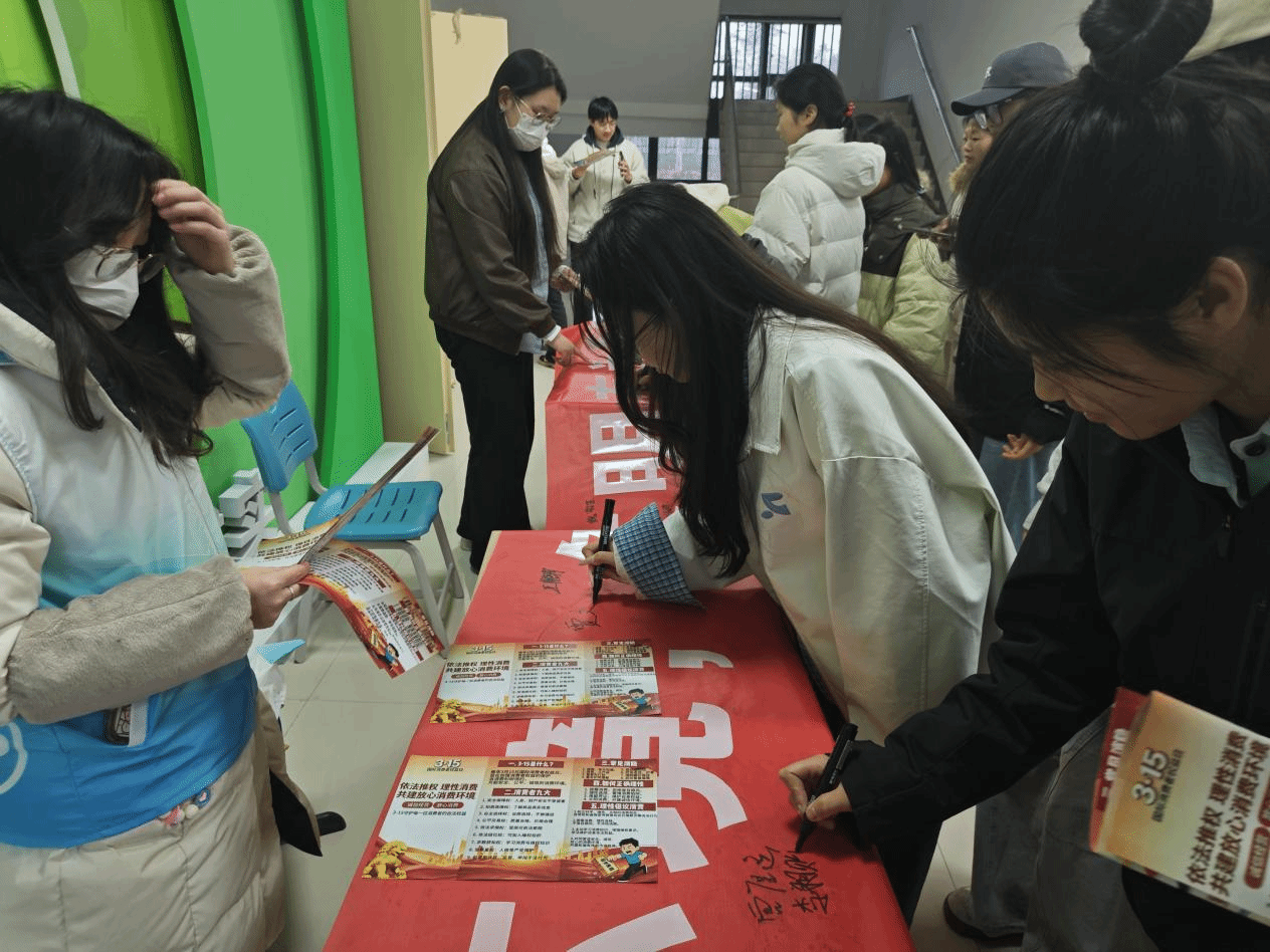 “理性消费”万人签名环节将活动氛围推向高潮,同学们在横幅上郑重签名,以此表达对理性消费、依法维权的认同与承诺。活动过程中,志愿者统一着装、服务热情,现场秩序井然。